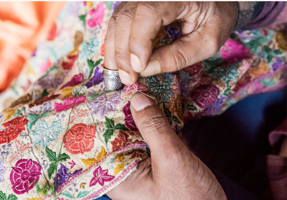 This is the art of Aari embroidery—where every stitch is guided by the steady hands of Kashmiri artisans. Using a tiny hooked needle and years of practiced skill, they bring to life vibrant florals and intricate patterns, one thread at a time.