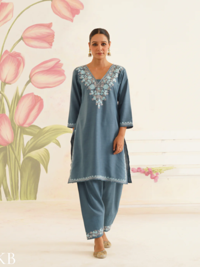 Slate Blue Cotton Coordset with Sky Blue Embroidery | Bahaar Collection 2025