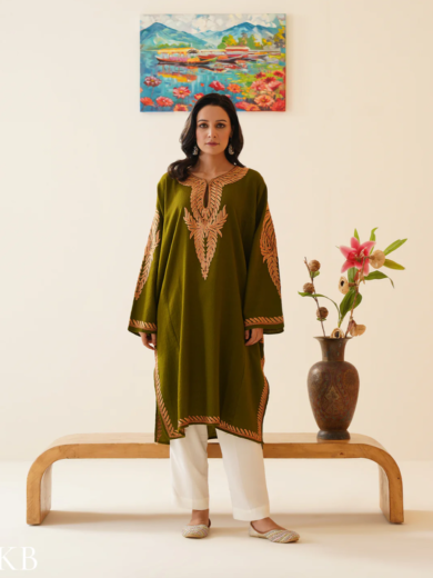 This is the art of Aari embroidery—where every stitch is guided by the steady hands of Kashmiri artisans. Using a tiny hooked needle and years of practiced skill, they bring to life vibrant florals and intricate patterns, one thread at a time.