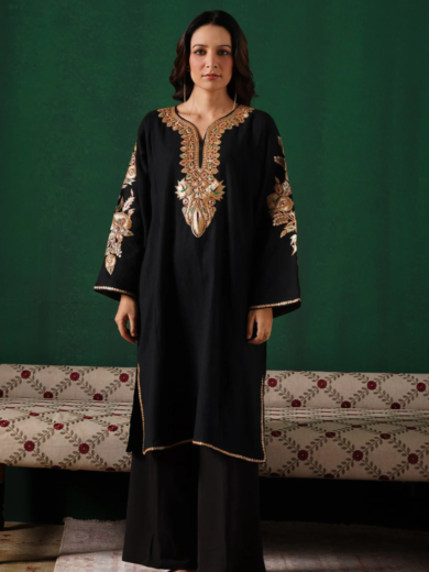Kashmiri Golden Boti Tilla Embroidered Pure Woollen Phiran – Black | Handcrafted Heritage