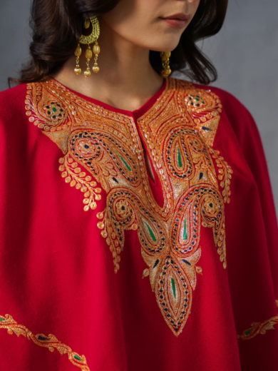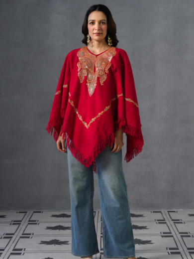 Kashmiri Golden Boti Tilla Embroidered Woollen Poncho – Red | Handcrafted Heritage