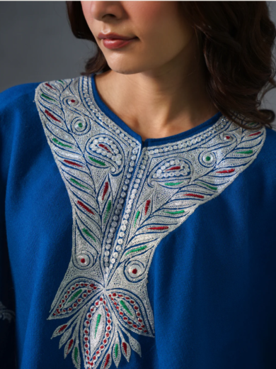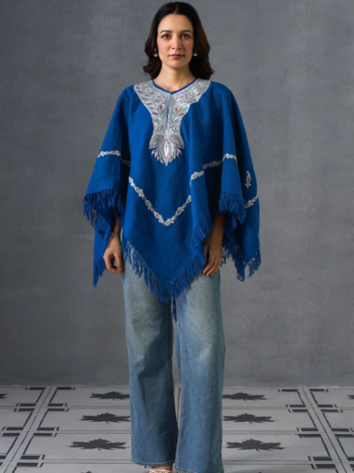 Kashmiri Silver Boti Tilla Embroidered Woollen Poncho – Blue | Handcrafted Heritage