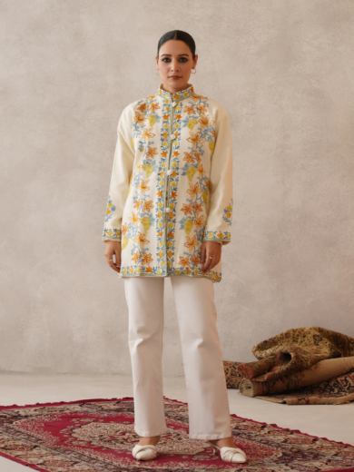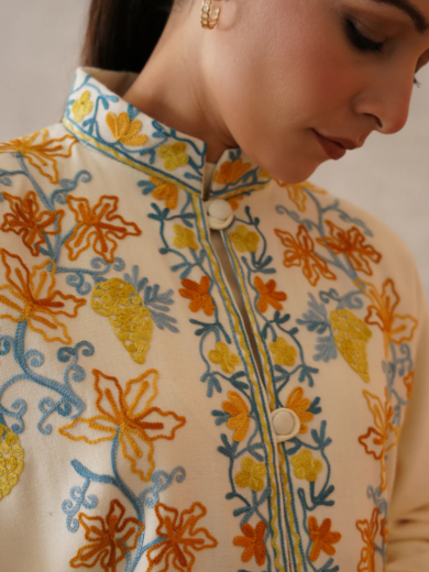 Nayaab Classic Cream Kashmiri Aari Cashmilon Jacket