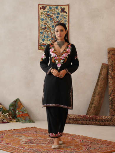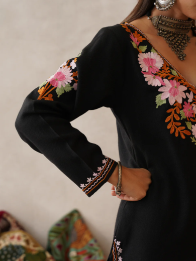 meHER Bold Black Kashmiri Aari Woollen Co-ord Set